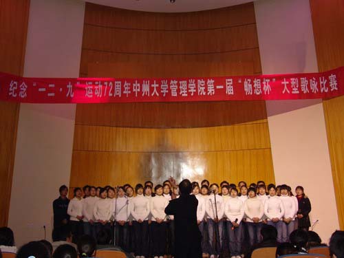 为纪念“一二九”运动,缅怀那些为中国革命的胜利所做出贡献的革命先烈和爱国青年,由球王会分团委主办的纪念‘一二九’运动72周年中州大学球王会第一届“畅想杯”大型歌咏比赛于2007年12月4日晚18:30在学术交流中心报告厅隆重举行。