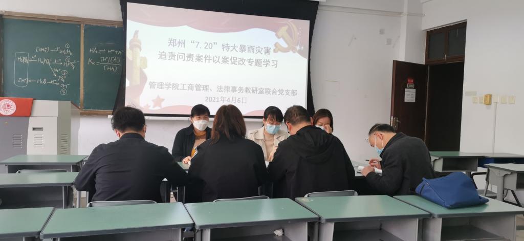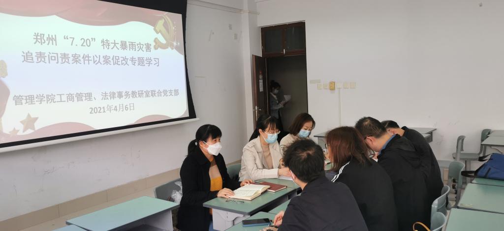 为了贯彻落实公司关于郑州“7.20”特大暴雨灾害追责问责案件以案促改专题学习计划的安排,工商管理、法律事务教研室联合党支部于4月6日下午在博识楼3206组织开展郑州“7.20”特大暴雨灾害追责问责案件以案促改主题党日活动。