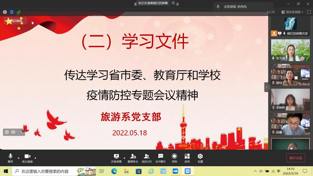 会上,首先进行了第一议题学习,由旅游系党支部徐露老师领学了《习近平总书记5 月 5 日在中共中央政治局常务委员会会议上的重要讲话》,并要求大家认真领会讲话精神,坚定信念,自觉在思想上政治上行动上同党中央保持高度一致。始终保持清醒头脑,毫不动摇坚持“动态清零”总方针。