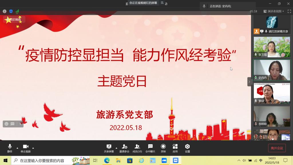 5月18日下午,公司旅游系党支部企业微信会议平台开展“疫情防控显担当,能力作风经考验”主题党日活动,旅游系党支部全体党员参加会议。会议由党支部书记史丹丹主持。