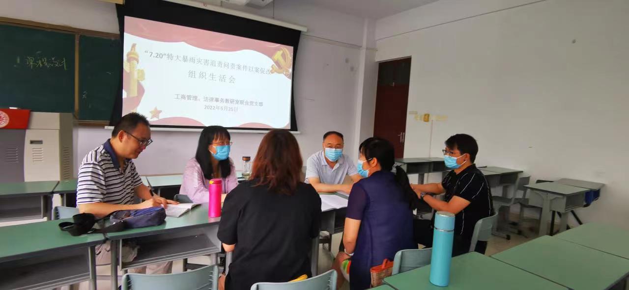 根据上级党组织要求,2022年5月25日,球王会工商管理、法律事务教研室联合党支部在3206召开“7.20”特大暴雨灾害追责问责案件以案促改专题组织生活会。本次专题组织生活会是深入学习贯彻习近平新时代中国特色社会主义思想,全面落实郑州市“7.20”特大暴雨灾害追责问责案件以案促改工作的重要举措。组织生活会由支部书记陈凤菊主持。