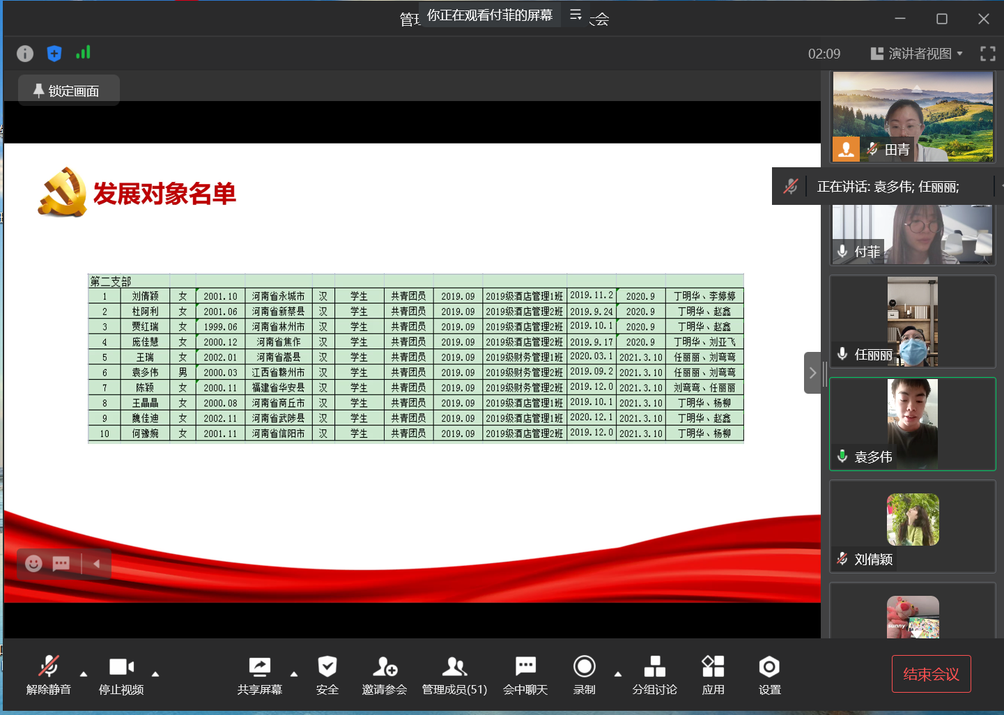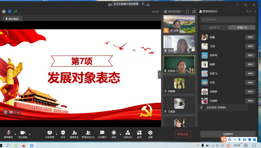 会议主要内容是讨论支部接收庞佳慧等10名发展对象为中共预备党员的事宜。首先,发展对象逐一宣读入党志愿书,入党介绍人分别对发展对象各方面表现进行汇报。汇报后,付菲老师代表支委会向支部大会汇报对发展对象审议的情况。最后,通过无记名投票,与会人员一致同意接收庞佳慧等10名同志为中共预备党员。