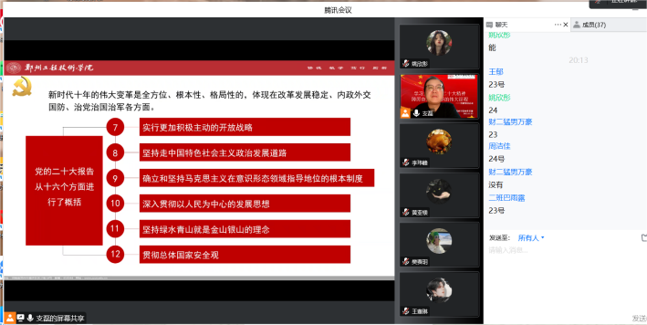 为深入学习宣传贯彻党的二十大精神,班导师将党的二十大精神带进课堂、带进班级,切实让大会精神走进员工们的内心中、头脑里,转化为践行使命担当的前进动力。工程管理系班导师孙海玲、刘丽娜、支磊、贾美芹老师分别为2021工程管理专升本1班、2021工程管理专升本2班、2021财务管理2班、2022财务管理4班以网络课堂的形式宣讲党的二十大精神。