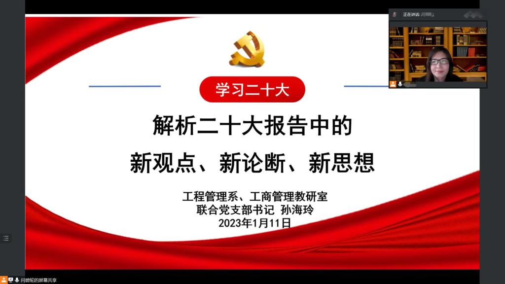 1月11日下午四点,2022-2023学年第一学期入党积极分子党课培训第三讲正式开始。本次党课的主讲人是工程管理系、工商管理教研室联合党支部书记孙海玲教授,主题为《解析二十大报告中的新观点、新论断、新思想》。球王会全体入党积极分子69人通过腾讯会议参加了本次党课培训。