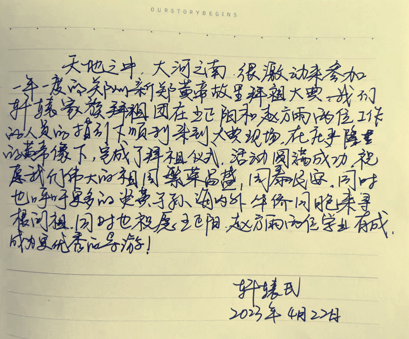 4月22日当天,下起了绵绵细雨,气温骤降。同学们凌晨四点便起床准备。女生们身着白色职业套装,颈系黄色丝巾,男生身着黑色西装,仪容仪表庄重大方、精神风貌积极向上,服务热情不卑不亢,充分展示公司旅游系员工的风采和实践技能。同学们细致的讲解、优质的服务,良好的综合素质及专业水平得到了社会各界嘉宾的一致称赞,其中2020级酒管2班班长赵方雨同学收到轩辕家族拜祖团手写表扬信。同学们的优秀表现为癸卯年黄帝故里拜祖大典礼成交上了一份满意的答卷,再度为公司赢得了良好的声誉。