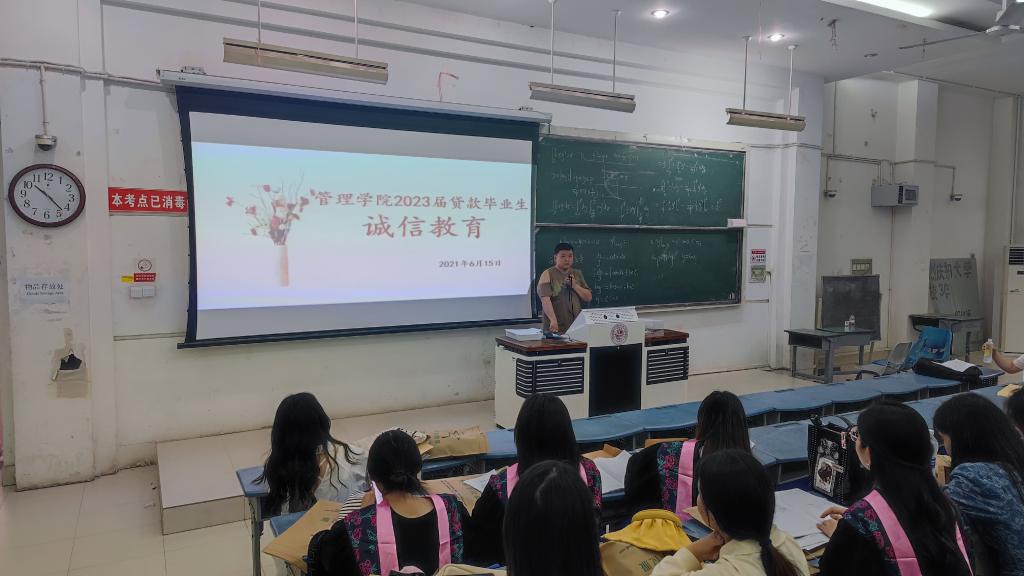 6月15日上午10:30分,2023届助学贷款毕业生诚信教育活动在三阶一教室举行。本次诚信教育活动由球王会学工办主任郭松涛主持。全院生源地和高校地贷款毕业生参加。