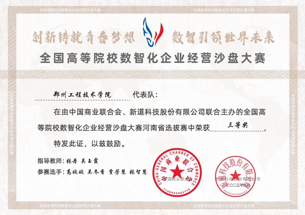 9月26日至27日,由中国商业联合会、新道科技股份有限公司联合主办,郑州大学承办的“第十九届全国高等院校数智化企业经营沙盘大赛河南省选拔赛(本科组)”比赛在郑州大学进行。这次比赛由来自省内40所本科院校的108支队伍,共计600余位师生参与。公司范新安、张丹、吴玉霞、郭峰老师指导的团队,荣获此次大赛省内三等奖。
