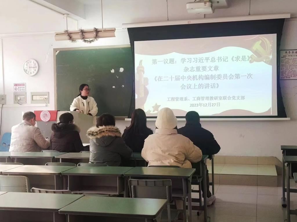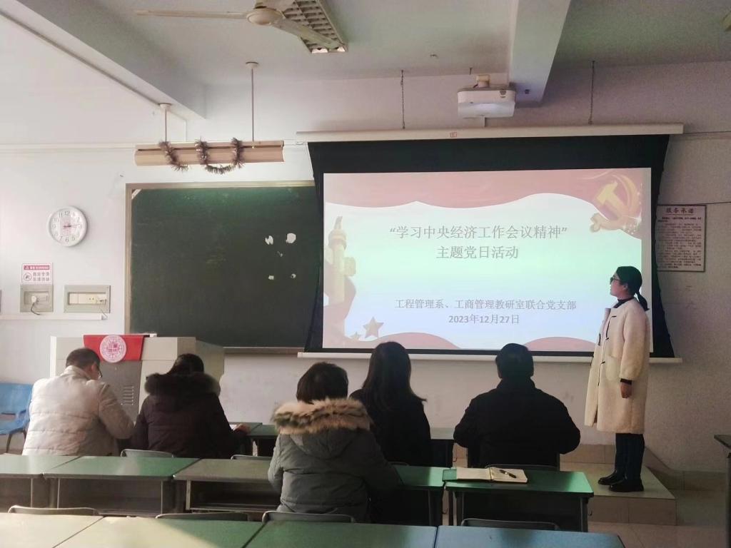 为深入学习中央经济工作会议精神,同心同力以实际行动助力高质量发展,12月27日下午,公司工程管理系、工商管理教研室联合党支部在3205教室,开展“学习中央经济工作会议精神”主题党日活动。支部全体教工党员参加了此次活动,此次主题党日活动由工程管理系、工商管理教研室联合党支部书记孙海玲教授主持。