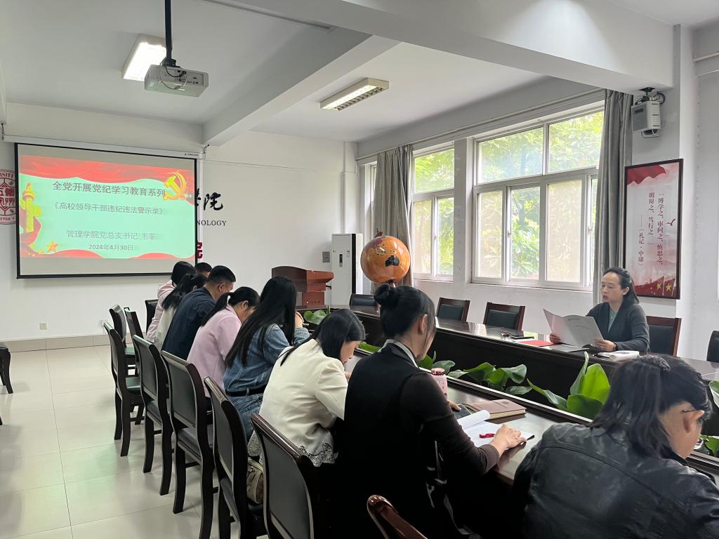 4月30日,为进一步强化党员干部的纪律意识,提升党性修养,公司党总支在公司3108会议室,组织开展党纪学习教育活动。此次活动由党总支书记韦菲领学《高校领导干部违纪违法警示录》,以案为鉴,为全体党员干部敲响警钟。