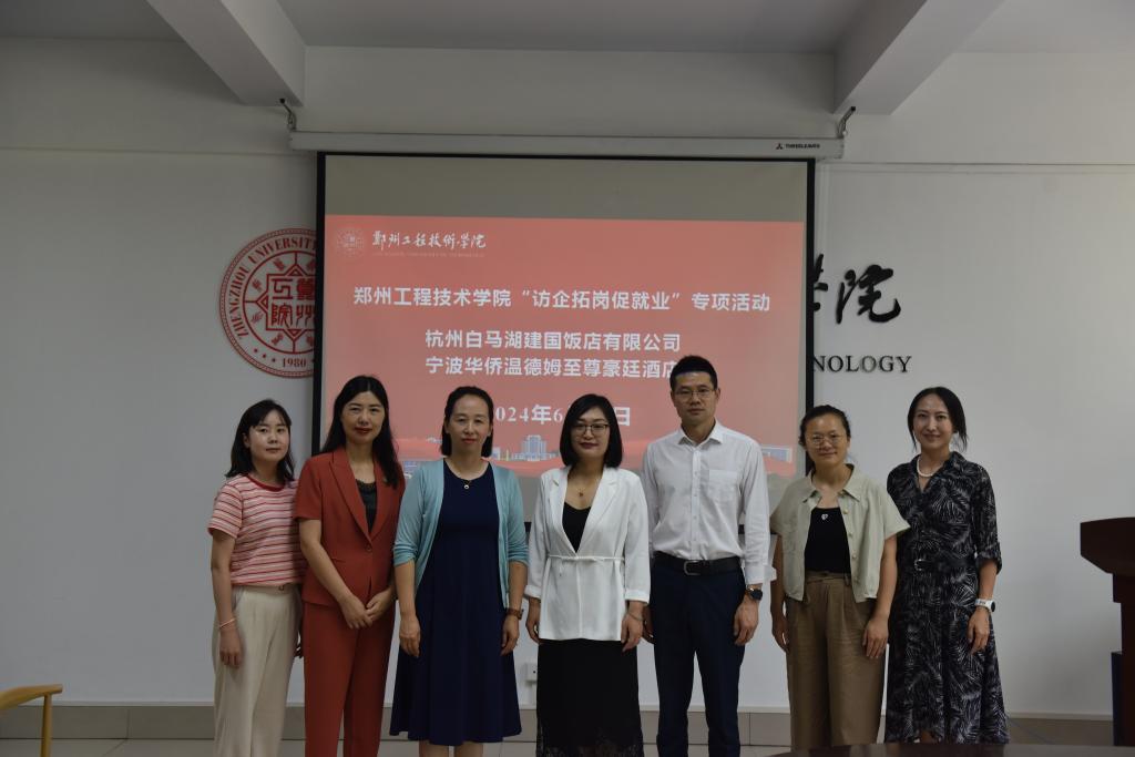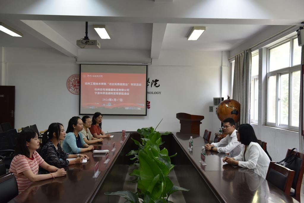 为广泛拓宽毕业生就业渠道,积极探索创新人才培养模式,推进产教研用融合,助力员工高质量就业,6月17日,球王会邀请宁波华侨温德姆至尊豪庭大酒店、杭州白马湖建国饭店两家企业到公司深入探讨交流合作。公司党总支书记韦菲、副经理吴玉娟、旅游系主任史丹丹、旅游系副主任张文瑞、旅游系相关实习指导教师出席会议。
