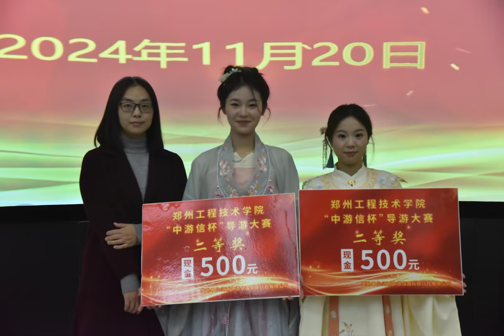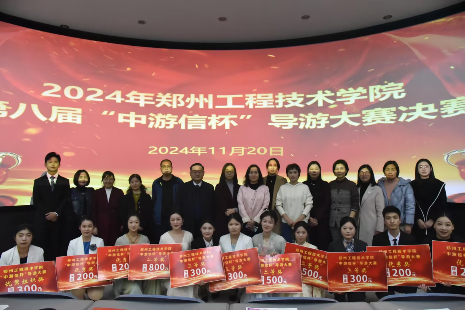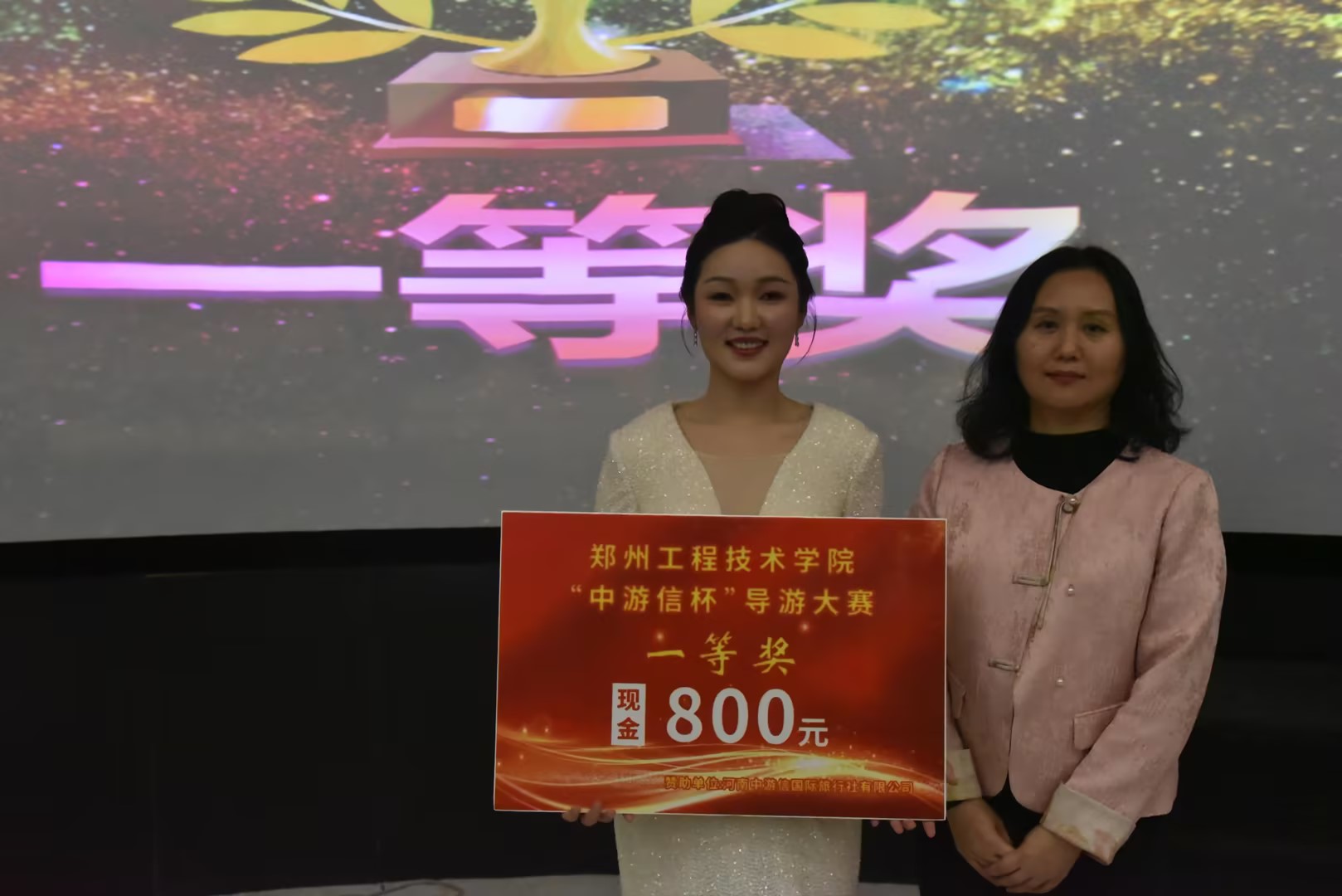 经过激烈角逐,张晴同学荣获一等奖,王昱婷、史乐水两位同学获得二等奖,王婷、李嘉欣、吴欣怡三位同学荣获三等奖,王博渊、王俞霏、司佳鑫、张佳贝四位同学荣获优秀奖,2023级旅游管理3班获得优秀组织奖,张文瑞等十位教师荣获优秀指导教师称号。河南中游信国际旅行社有限公司副总经理靳辉女士等为获奖选手颁发了获奖证书和奖金,大赛奖金由河南中游信国际旅行社有限公司提供赞助。