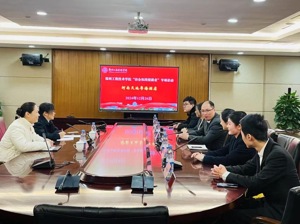12月26日下午,公司党总支副书记张彩虹老师一行走访了河南天地粤海酒店。酒店对此次校企交流活动非常重视,进行了精心的安排,专门选派前厅部经理郭恩和河南天地集团综合部经理李顺心参加了座谈。