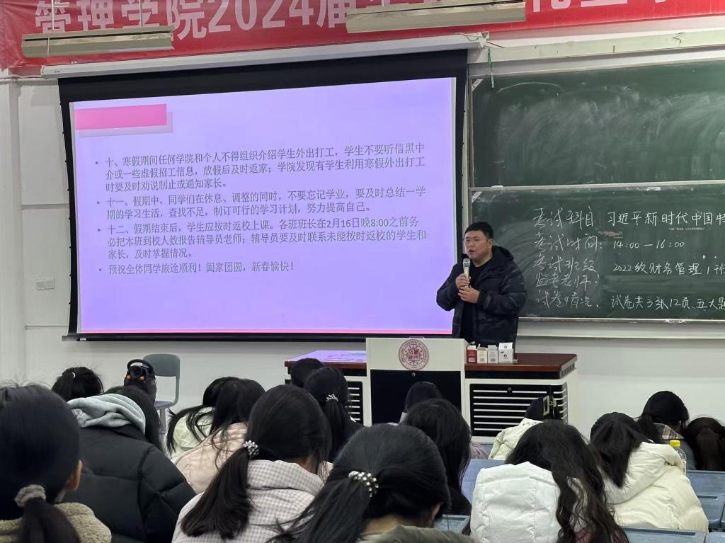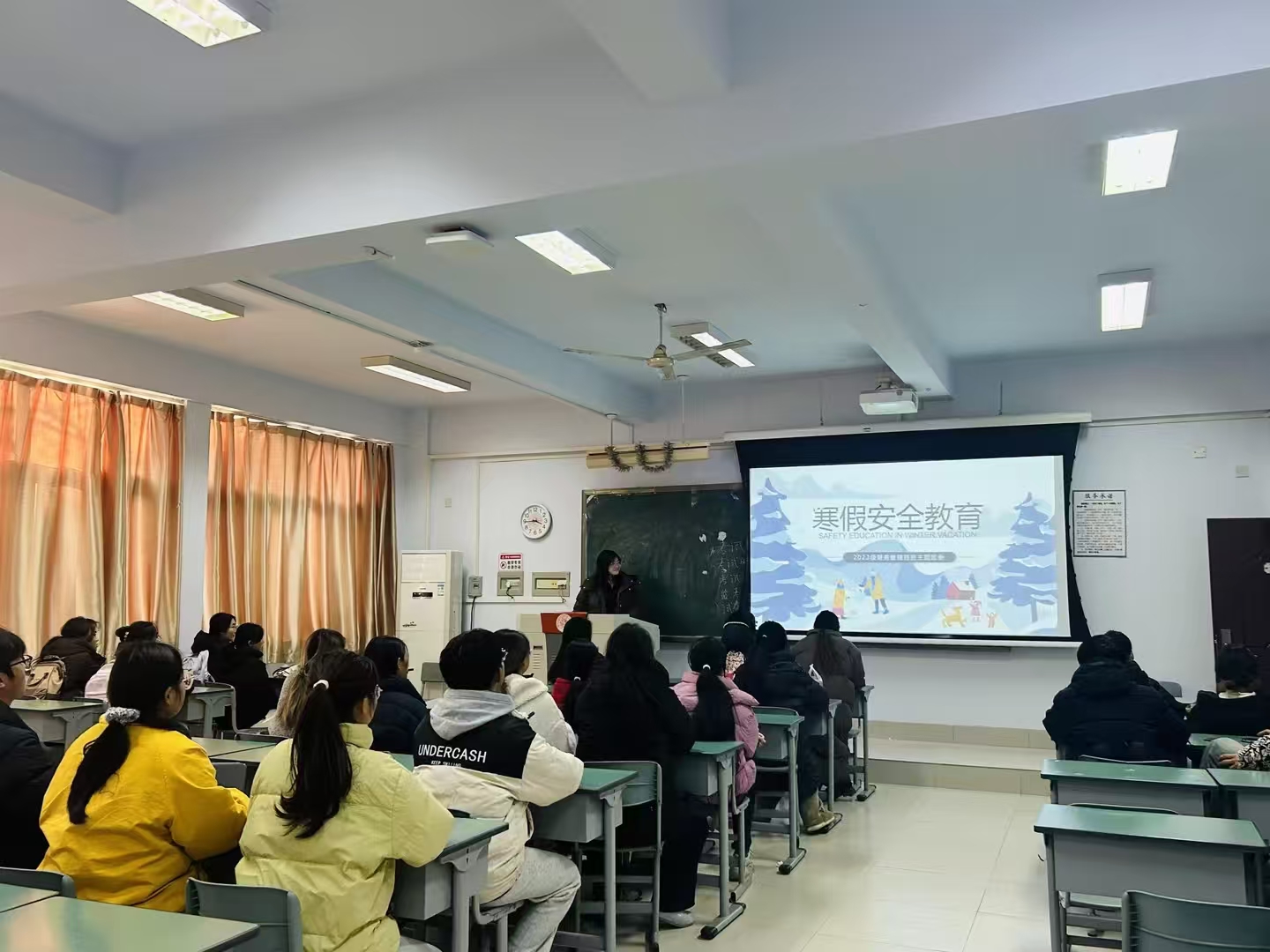 紧接着,辅导员老师结合寒假期间正值中国传统节日的特点,提醒同学们要尊重传统文化习俗,孝敬父母,重视家庭团聚。辅导员鼓励同学们利用假期时间,多陪伴家人,增进亲情,共同传承和弘扬中华优秀传统文化。同时,辅导员还建议同学们注意劳逸结合,多参加一些有益身心健康和社会文明的文体活动,如读书、运动、志愿服务等,切勿参与非法传销、封建迷信和“黄、赌、毒”等违法或有悖社会公德的活动。
