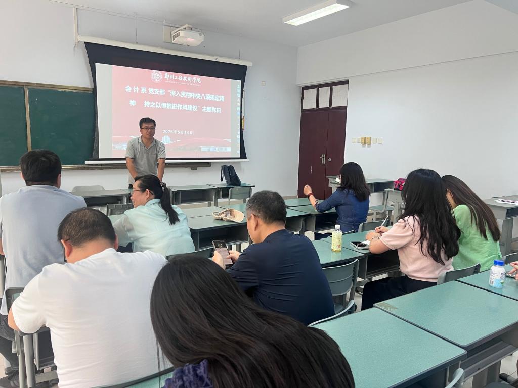 活动首先以“第一议题”的形式学习了习近平总书记关于加强党的作风建设的重要论述;接下来支部全体党员共同学习《违反中央八项规定及其实施细则精神典型案例》;随后会计系党支部书记殷瑞普围绕学习领会和贯彻执行中央八项规定及其实施细则精神讲授专题党课;然后支部党员围绕学习内容进行讨论,交流学习心得,共同探讨如何将会议精神落实到具体工作中。殷瑞普最后强调:要将学习成果转化为行动自觉,将中央八项规定精神内化于心、外化于行,切实改进工作作风,营造风清气正、务实高效的工作氛围。
