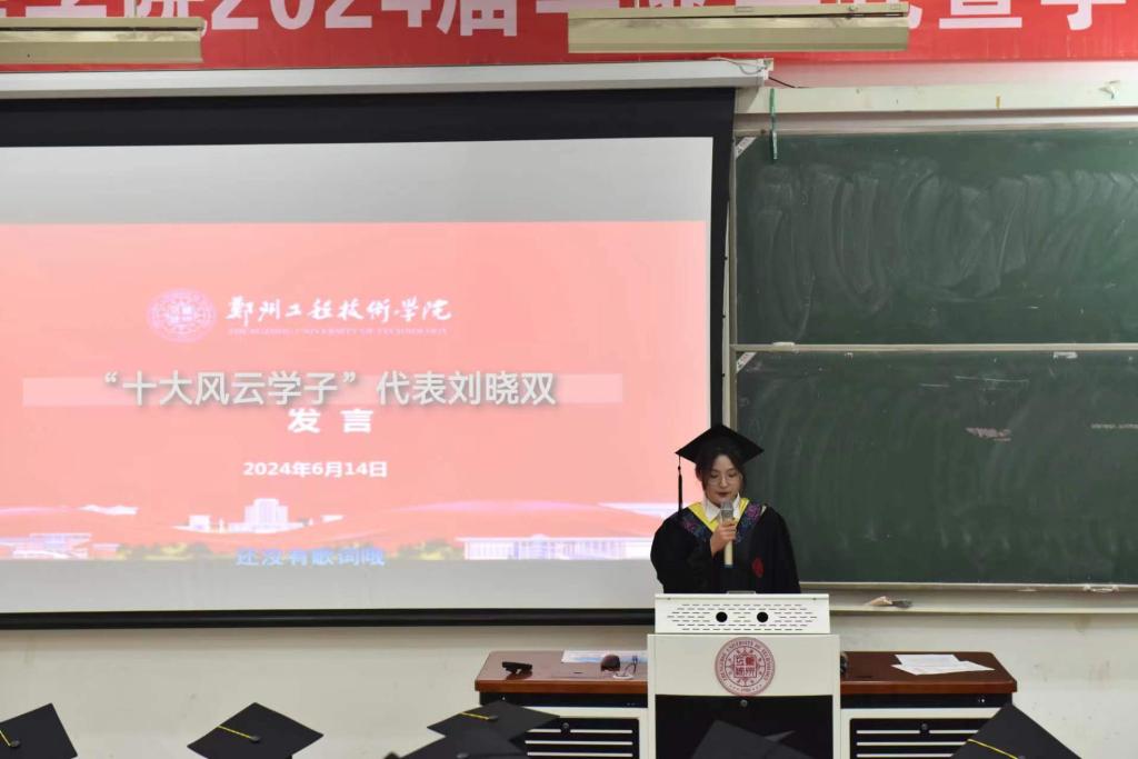 2020级工程管理专业刘晓双同学代表获奖员工发言。她回顾了大学四年里,自己在学业、实践和创新等方面的努力和收获,感谢公司和老师们的悉心指导和关怀,也感谢同学们的陪伴和支持。刘晓双同学讲到,风云学子们所代表的不仅仅是个人的成就,更是郑工精神和球王会优良传统的体现。她呼吁在场的每一位同学,都要勇于追求自己的梦想,不断提升自己的综合素质和能力。
