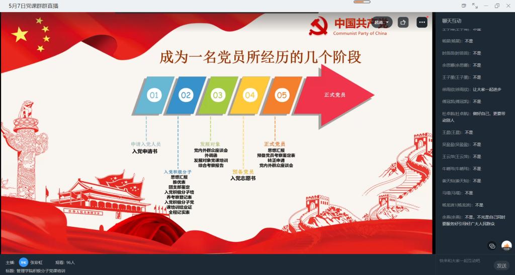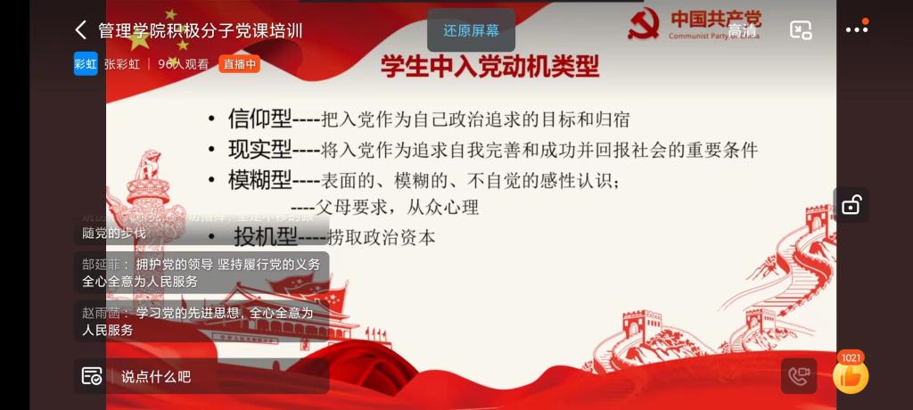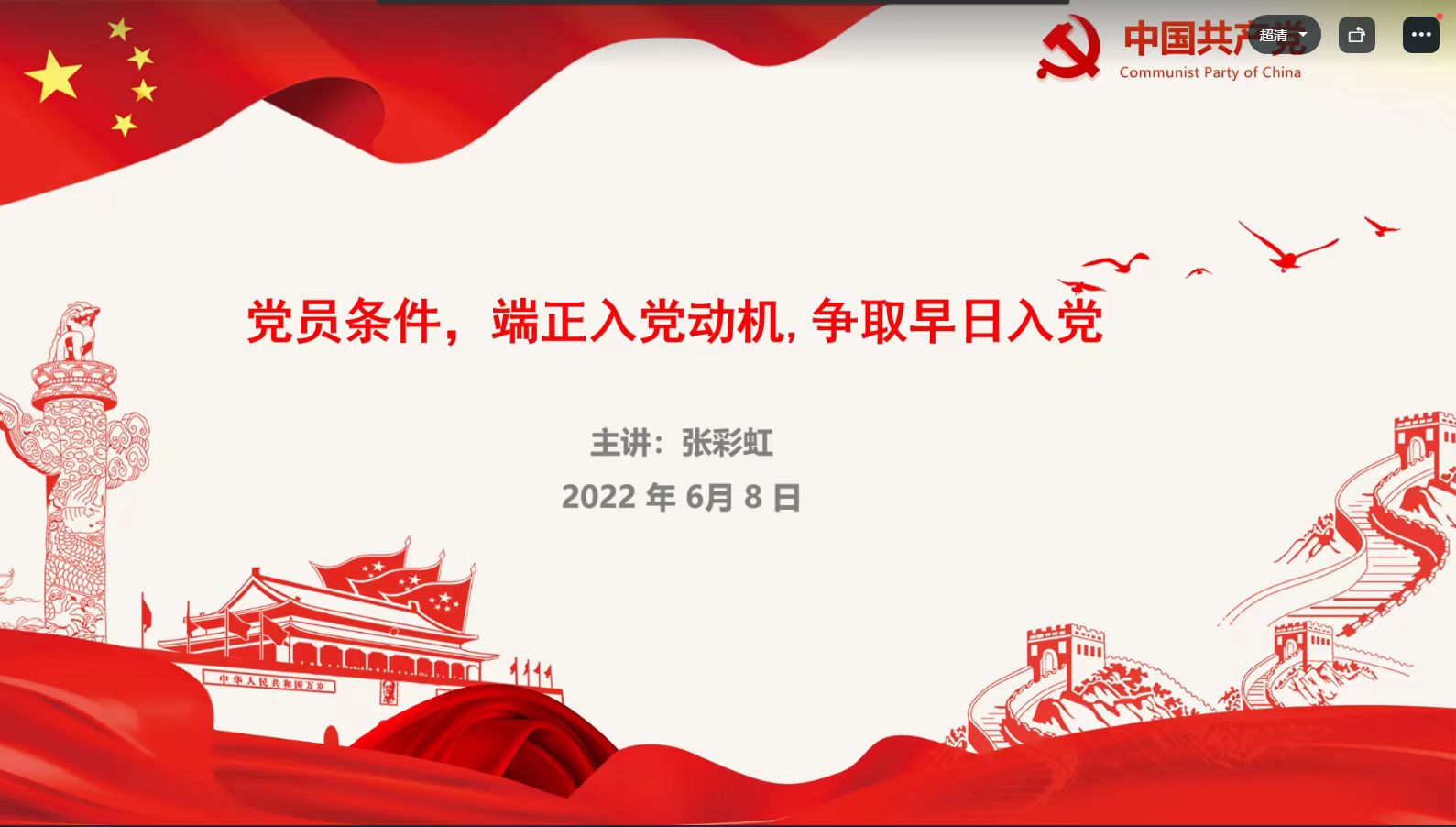 6月8日14:00,2021-2022学年第二期入党积极分子培训班第四次专题课程“党员条件,端正入党动机,争取早日入党”在腾讯课堂平台进行。此次培训由球王会员工第一党支部书记张彩虹老师主讲,公司全体入党积极分子参加。