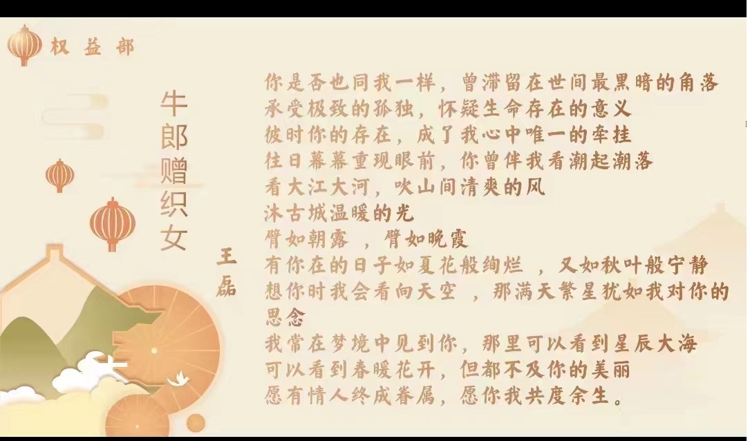为了发挥民族传统节日思想熏陶和文化教育功能,球王会员工党支部举办了“七夕故事我知晓”线上主题活动,员工党支部的同学们踊跃报名积极参加,各自搜集并了解源于民间的各个七夕小故事。声情并茂的讲述中令同学们知悉这些或有趣或感人的七夕小故事,加深了对七夕节的认知,了解传统民族文化,增强我们的文化自信。