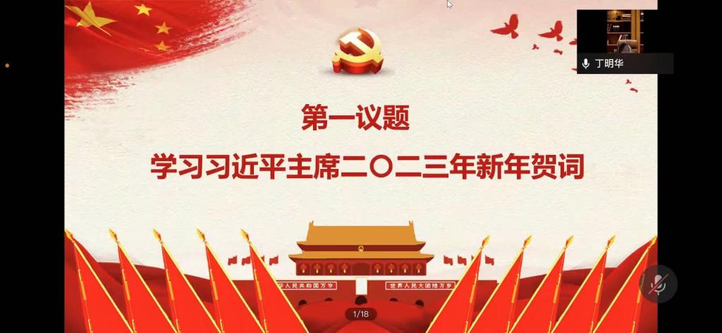首先,会议第一项由宣传委员丁明华老师领学第一议题,深入学习习近平总书记二〇二三年新年贺词,习近平总书记深情回顾党和人民走过的极不平凡征程,鲜明宣示把新时代中国特色社会主义事业不断推向前进的坚定决心和必胜信心,号召全党全国各族人民团结奋斗,共创美好未来。
