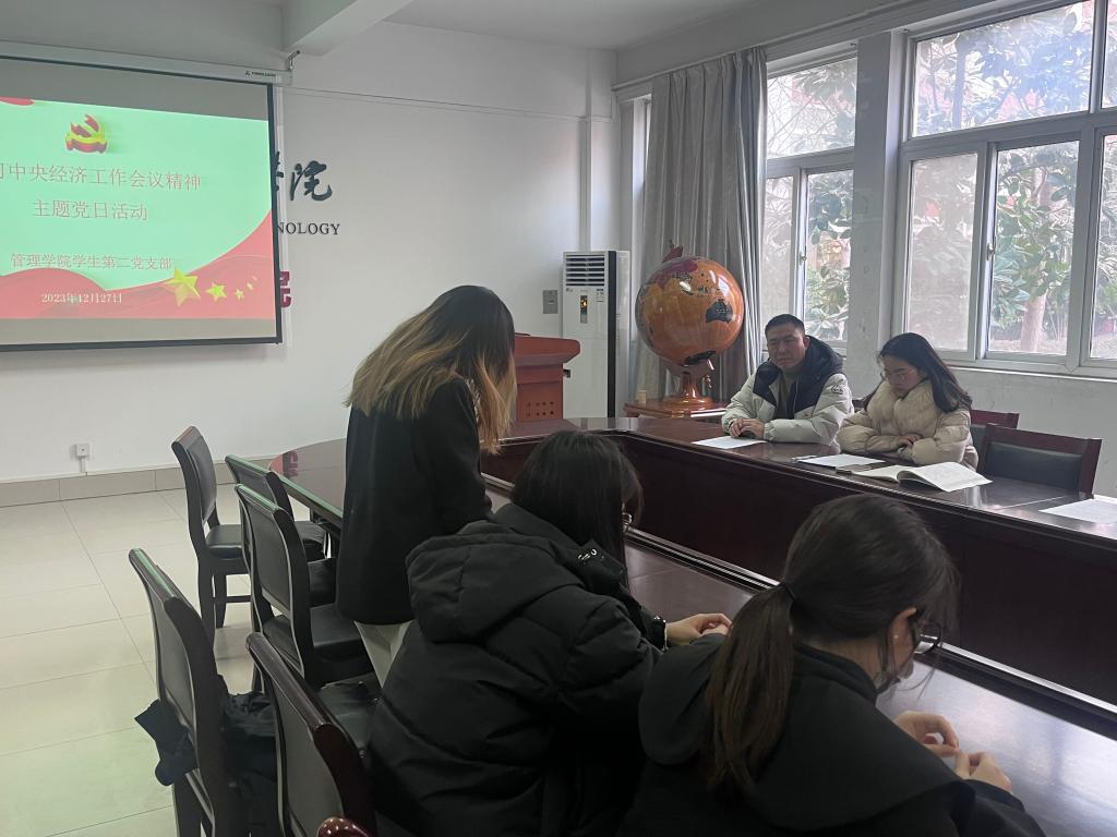 会议第二项,由员工第二党支部组织委员张花杰老师领学“学习中央经济工作会议精神”。习近平总书记出席该会议并发表重要讲话,全面总结2023年经济工作,深刻分析当前经济形势,系统部署2024年经济工作,为中国经济高质量发展定向领航。该会议号召,全党要紧密团结在以习近平同志为核心的党中央周围,要坚定信心、开拓奋进,努力实现经济社会发展各项目标任务,以高质量发展的实际行动和成效,为以中国式现代化全面推进强国建设、民族复兴伟业作出新的更大贡献。通过学习会议内容和会议精神,参会师生热烈讨论,王浩迪、闫琬珺、杨纤纤等7名员工党员发表学习心得。
