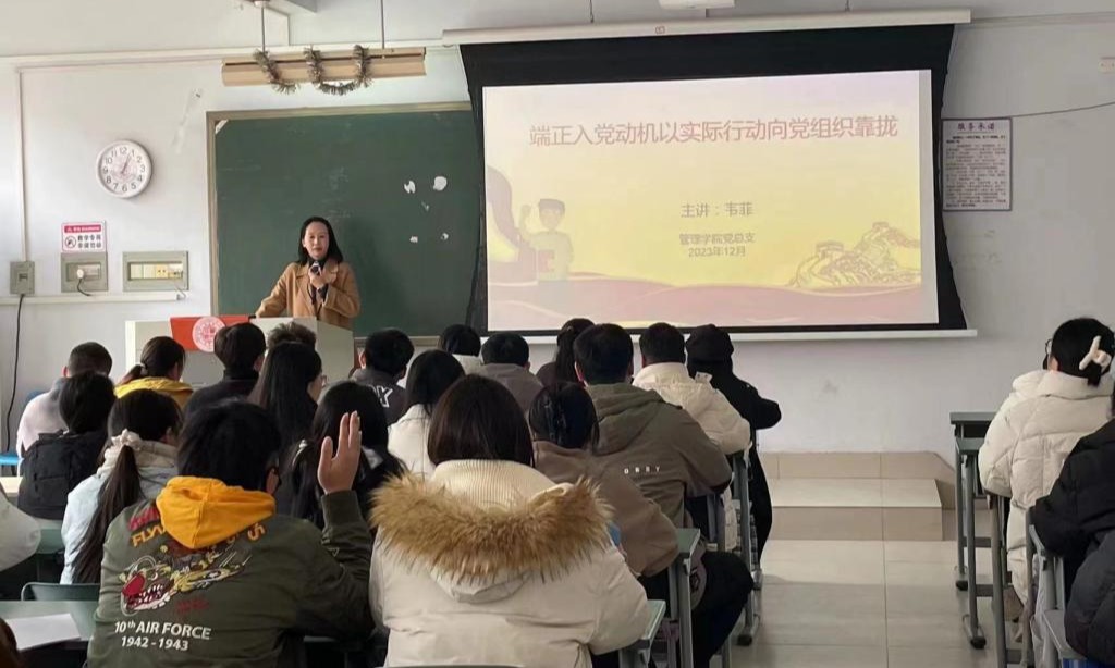12月27日,2023-2024学年第一期入党积极分子党课培训第三讲开讲。本次党课由公司党总支书记韦菲主讲,题目为《端正入党动机以实际行动向党组织靠拢》。2023年9月入党积极分子参加了培训。