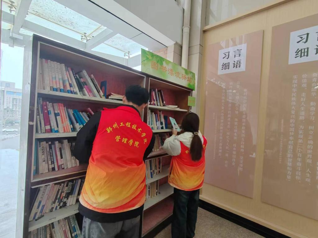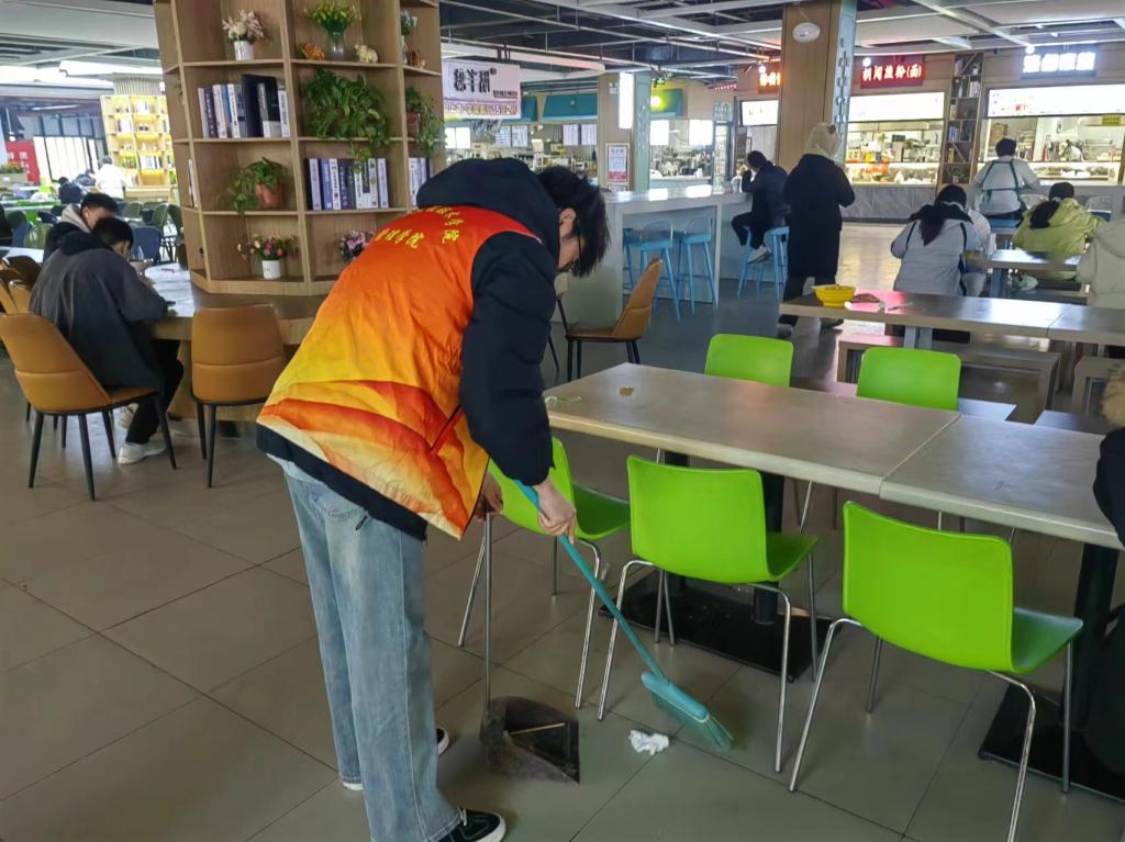 在图书馆,志愿者们对图书馆前空地、图书馆内地面进行了打扫和垃圾归类归箱。在“图书漂流驿站”,一些图书随意摆放,有些上面灰土集聚,志愿者们也进行了摆正和对图书的擦拭。最后在图书馆老师的指导下,又在大阅览室针对书架和大桌子上的图书进行正确摆放和桌面的打扫与擦拭。
