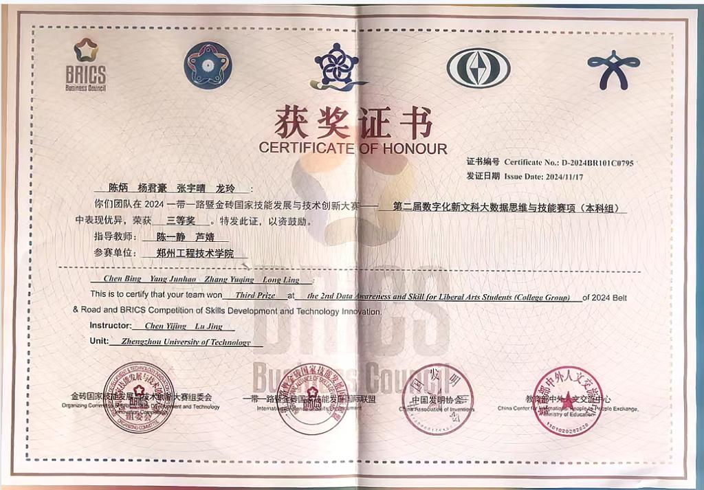 在2024年度备受瞩目的“一带一路暨金砖国家技能发展与技术创新大赛之第二届数字化新文科大数据思维与技能赛项(本科组)”比赛中,公司球王会员工团队在激烈角逐冲进决赛,荣获三等奖的佳绩。本次大赛不仅是对公司在大数据教育领域的深耕教育的一次具体实践,也充分展示了员工在实践能力和创新思维方面的卓越风采。