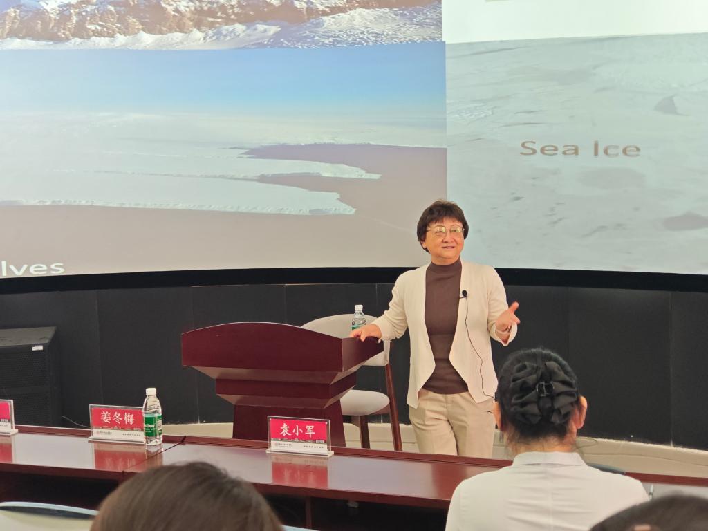 随后,袁小军教授带来题为《气候变化影响:极地冰冻圈与全球海平面上升》的专题报告。讲座聚焦全球气候变化背景下,极地冰冻圈的结构、功能及其演变趋势。袁教授指出,陆地冰的持续融化已成为推动全球海平面上升的主要动力,而海冰的减少则显著削弱了地球的反照率,导致极地放大效应加剧。结合多年来的卫星观测数据,袁教授详细分析了北极海冰面积显著减少、南极冰架底部加速消融的事实,并基于格陵兰与南极的观测证据,从融化天数增加、冰流加快、高度降低、质量减少四个维度系统揭示冰盖变化趋势。