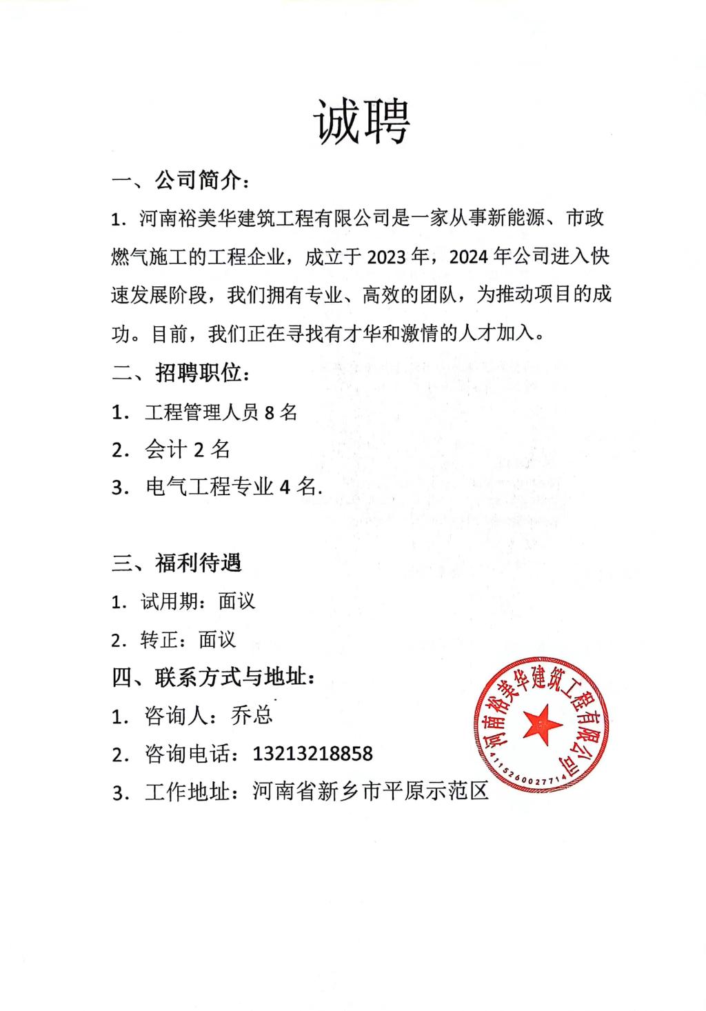 河南裕美华建筑工程有限公司招聘简章