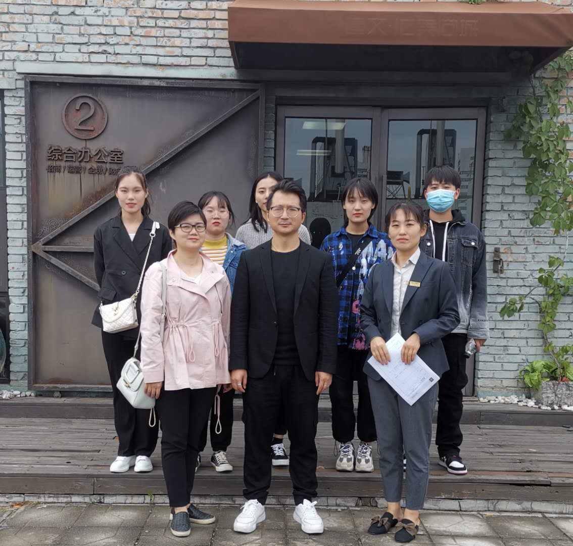 指导老师郭峰、董甲婷老师与在汇美尚城实习的员工合影